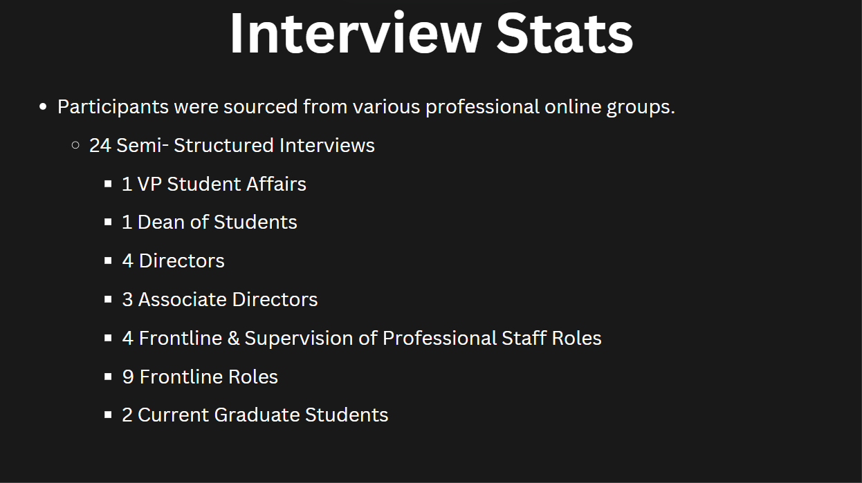 To the left, I have included the advertisement for this study and below I have included slides from a recent presentation on the first two rounds of study that predated this current work. Finally, the bottom of the page includes real quotes from real practitioners in higher education and student affairs about their work within the field and their experiences with their supervisors.