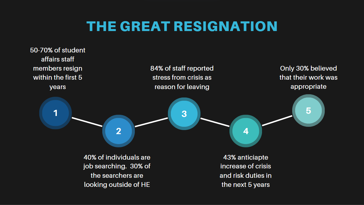 “....like I saw six kids dying a year. Right. And so most people when I was when I was a when I was, you know, an entry level Hall Director, we had one kid die, like maybe one could die in a car accident. You know, I saw four kids die by suicide and to die, you know, in an accident in one year. And so, the first time, it was very jarring, second time, that is much third time. It's like, Alright, here's the play, here's how we're doing this.“